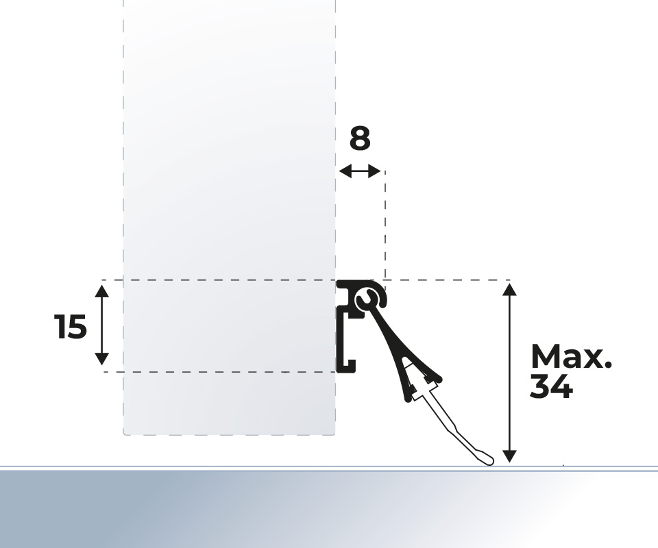 L’étanchéité est réalisée grâce au deuxième profile qui pivote dans son support et s’aplatit au sol contre la porte lors de sa fermeture, par la butée.
